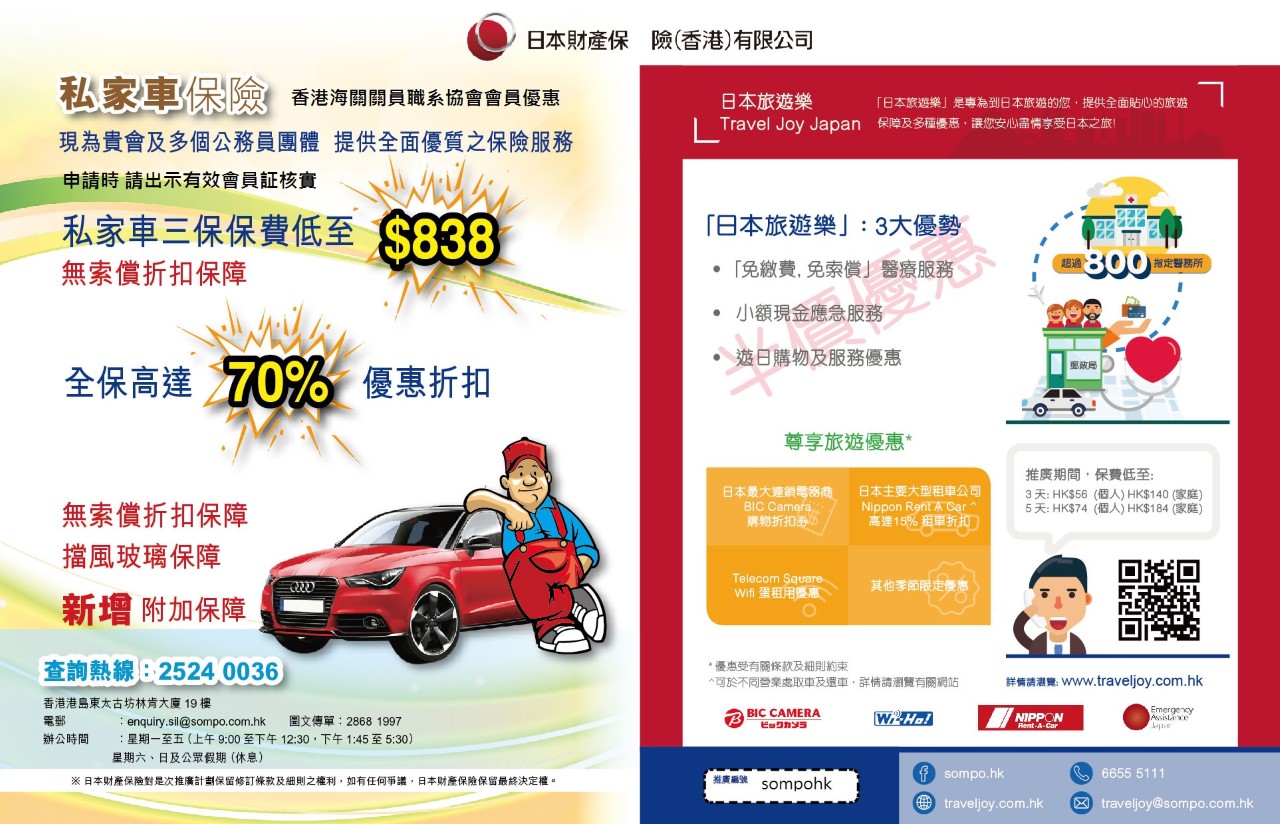 本會會員現可享日本財產保險(香港)有限公司 提供保險優惠,包括:私家車全保及第三保險